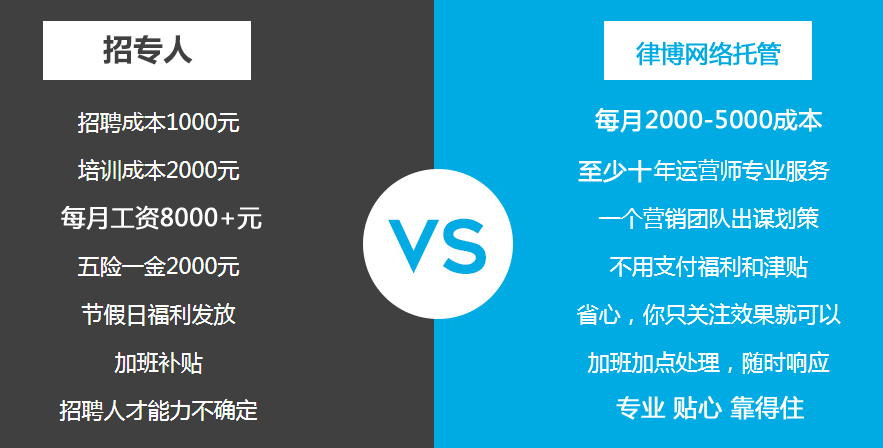 整體網(wǎng)絡托管也叫企業(yè)網(wǎng)絡部外包,這是什么意思呢: 目前幾乎所有企業(yè)都會利用互聯(lián)網(wǎng),做網(wǎng)站,做推廣等等。很多企業(yè)都是找一個網(wǎng)絡公司做網(wǎng)站,有的會找各種推廣公司進行網(wǎng)絡廣告推廣。那么問題來了,如何才能低價高效的利用互聯(lián)網(wǎng)呢?有很多公司組織了自己的網(wǎng)絡部,但是這個成本也是比較大的,一個技術人員工資就非常高,還有各種福利,更不用說要幾個人的團隊,對于大部分企業(yè)來說,也是比較浪費的。 整體網(wǎng)絡托管服務有哪些呢: 1,幫助企業(yè)制作網(wǎng)站,有必要的可以制作多個站群進行推廣。(一年節(jié)約上萬費用) 同樣解決問題,和招人待遇對比,費用超低,節(jié)約一半以上: 具體服務內(nèi)容包括且不限于上面幾條。這就是為什么,企業(yè)需要一個網(wǎng)絡整體托管的合作伙伴,當然我們帶給企業(yè)的價值,遠遠不止一年節(jié)約這些費用,而是真正的從實戰(zhàn)出發(fā),提供低價高效的網(wǎng)絡推廣營銷手段,讓企業(yè)從網(wǎng)絡上獲得訂單,賺取更多的利潤價值。
